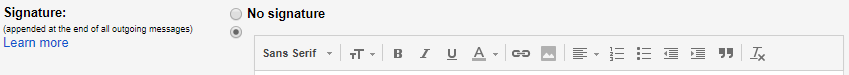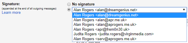 Where an account is configured with more than one reply address, a separate signature can be configured per address using the drop-down menu. The changes per signature will be saved as each is edited but the whole will only be committed if the [Save] button at the bottom of the page is clicked.